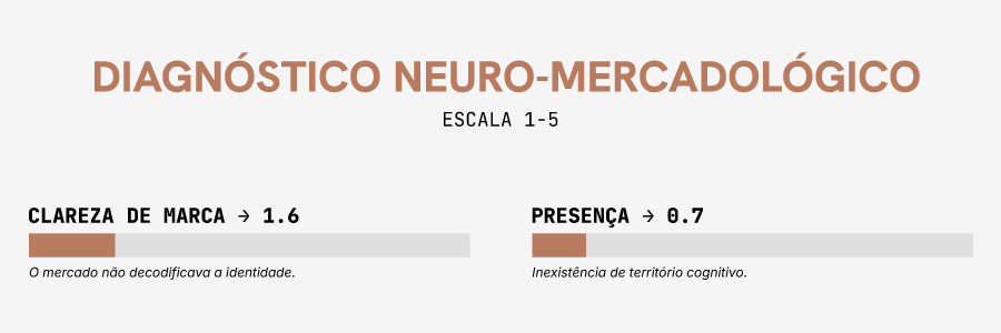 O diagnóstico apontou baixa clareza e presença – sinal de que o mercado não tinha um atalho mental para lembrar, confiar e preferir.