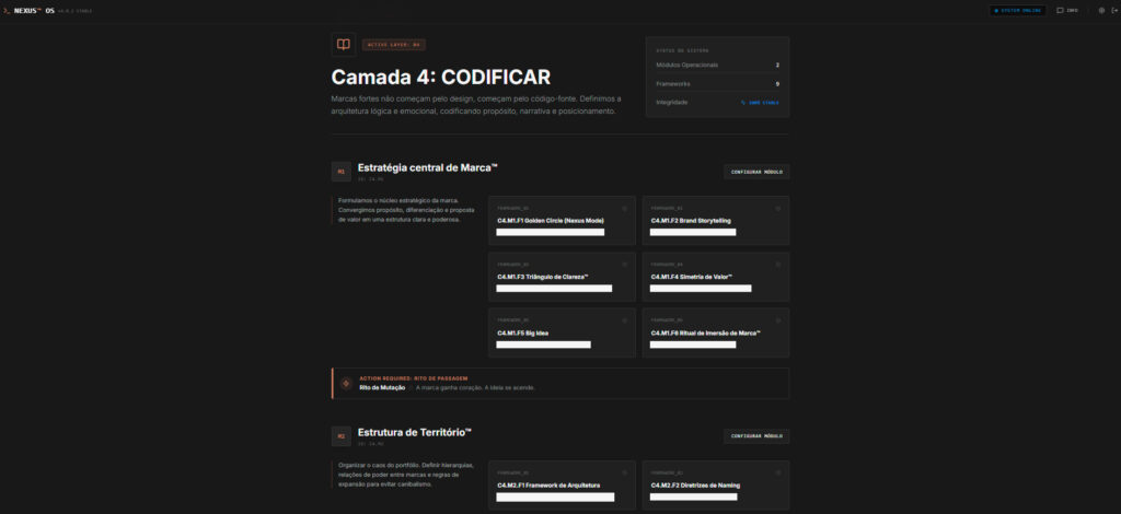 O projeto incluiu um diagnóstico neuro-perceptivo, engenharia de identidade e um codex de marca para garantir consistência e governança – não apenas estética.
