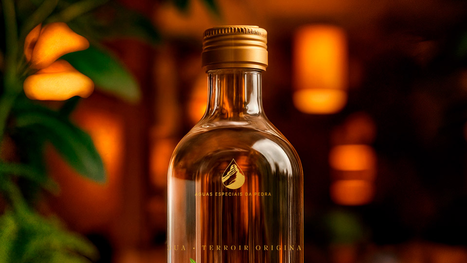 Rótulo (Semiótica): A hierarquia visual prioriza a origem (“Águas Especiais da Pedra”) e utiliza texturas que evocam a joia bruta.