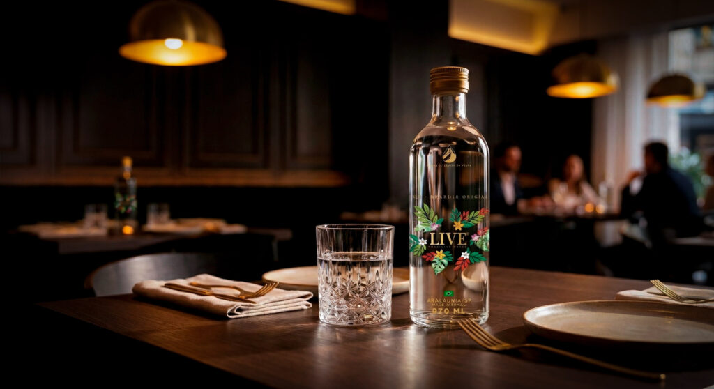Shape (Garrafa): Abandonamos os códigos de garrafas de água tradicionais. Adotamos uma estrutura diferenciada com peso e ergonomia que remetem à perfumaria e destilados de alto padrão (Gin/Vodka).